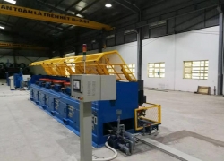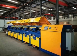 14、交流變頻直線式拉絲機電氣控制系統(tǒng):本系統(tǒng)采用變頻器調(diào)速,PLC程序控制器集控的方式,實現(xiàn)數(shù)字化自動化控制。機臺上每個頭都有啟動、停止、點動按鈕、張力氣壓調(diào)節(jié);機臺前緊急停車拉繩。觸摸屏上有速度顯示與調(diào)速,重量或者長度設(shè)定或解除。運行機臺號,運行電流(觀察電流大小可以清晰知道模具磨損狀態(tài)),運行頻率(觀察頻率大小可以知道實際最大工作速度),每個頭的功率。觸摸屏上輸入實際運行的模具,可以直觀的顯示每道次的減面率,避免不合理的拉拔,通過觀察電流的波動可以發(fā)現(xiàn)并調(diào)整損壞的模具避免生產(chǎn)廢絲!系統(tǒng)還具備一些特色功能:穿絲點動永不斷絲功能,高速運行中斷絲自動緊急停車功能,遠程監(jiān)控檢修功能。所以高自動化智能化的電氣控制系統(tǒng)是高效低成本高質(zhì)量拉拔低碳鋼絲的最先進技術(shù)。