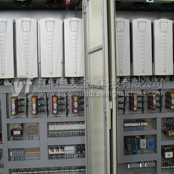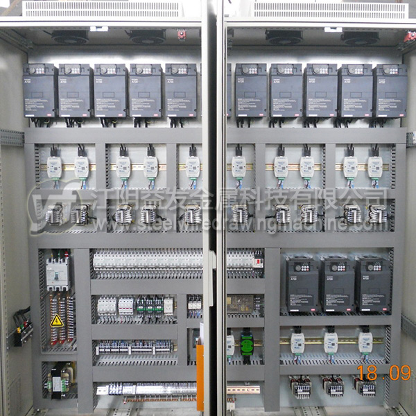 14、交流變頻直線式拉絲機電氣控制系統(tǒng):本系統(tǒng)采用變頻器調(diào)速,PLC程序控制器集控的方式,實現(xiàn)數(shù)字化自動化控制。機臺上每個頭都有啟動、停止、點動按鈕、張力氣壓調(diào)節(jié);機臺前緊急停車拉繩。觸摸屏上有速度顯示與調(diào)速,重量或者長度設(shè)定或解除。運行機臺號,運行電流(觀察電流大小可以清晰知道模具磨損狀態(tài)),運行頻率(觀察頻率大小可以知道實際*大工作速度),每個頭的功率。觸摸屏上輸入實際運行的模具,可以直觀的顯示每道次的減面率,避免不合理的拉拔,通過觀察電流的波動可以發(fā)現(xiàn)并調(diào)整損壞的模具避免生產(chǎn)廢絲!系統(tǒng)還具備一些特色功能:穿絲點動永不斷絲功能,高速運行中斷絲自動緊急停車功能,遠程監(jiān)控檢修功能。所以高自動化智能化的電氣控制系統(tǒng)是高效低成本高質(zhì)量拉拔低碳鋼絲的**技術(shù)。